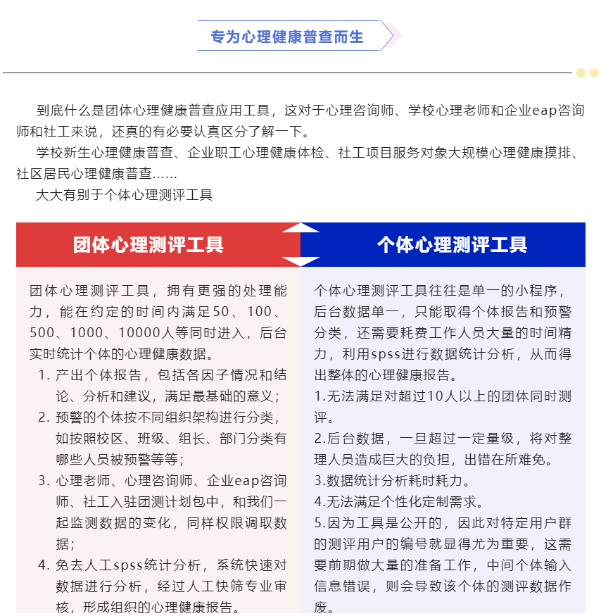 学校新生心理健康普查、企业职工心理健康体检、社工项目服务对象大规模心理健康摸排、社区居民心理健康普查......团体心理测评工具,拥有更强的处理能力,能在约定的时间内满足50、100、500、1000、10000人等同时进入,后台实时统计个体的心理健康数据。