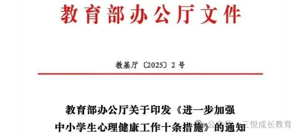 2025年10月9日,教育部办公厅印发了《进一步加强中小学生心理健康工作十条措施》,突出强调健康第一的教育理念,为当前全面、深入、系统开展全国中小学生心理健康教育工作提供了重要指导。
