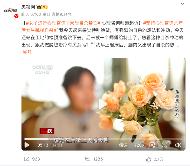 央视报道心理咨询致死案,“女子进行心理咨询后自杀身亡”引关注